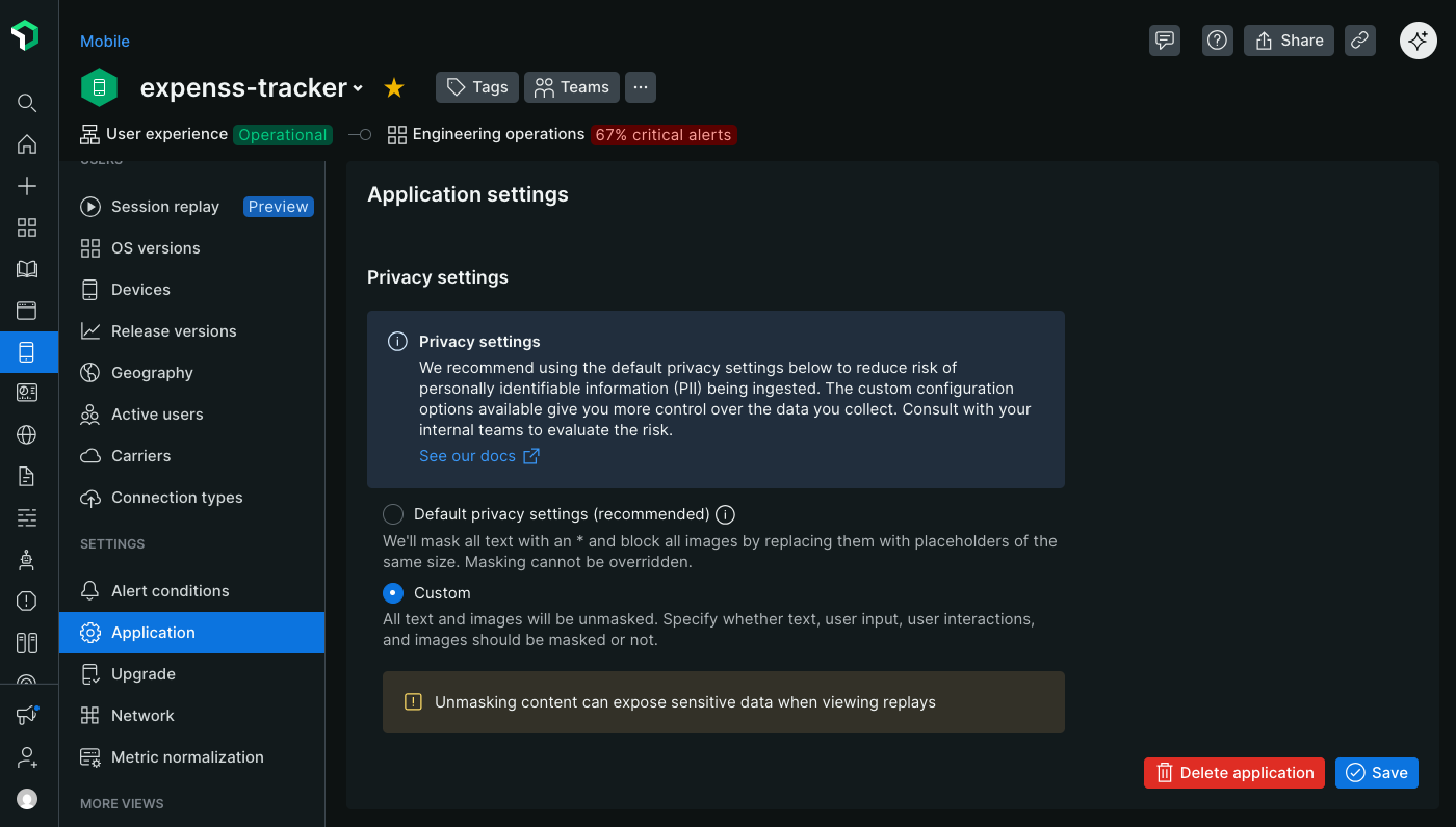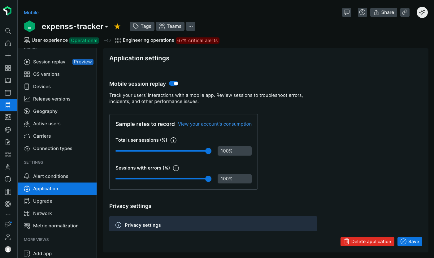 - Navigate to Mobile > [your entity] > Settings > Application > Session Replay.