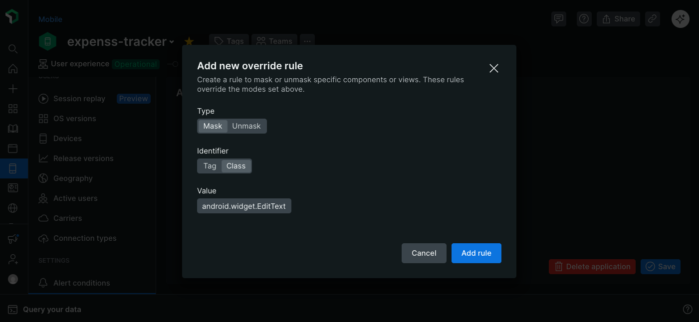 For example, a rule to Mask class android.widget.EditText would mask all user-editable text fields in an Android app.