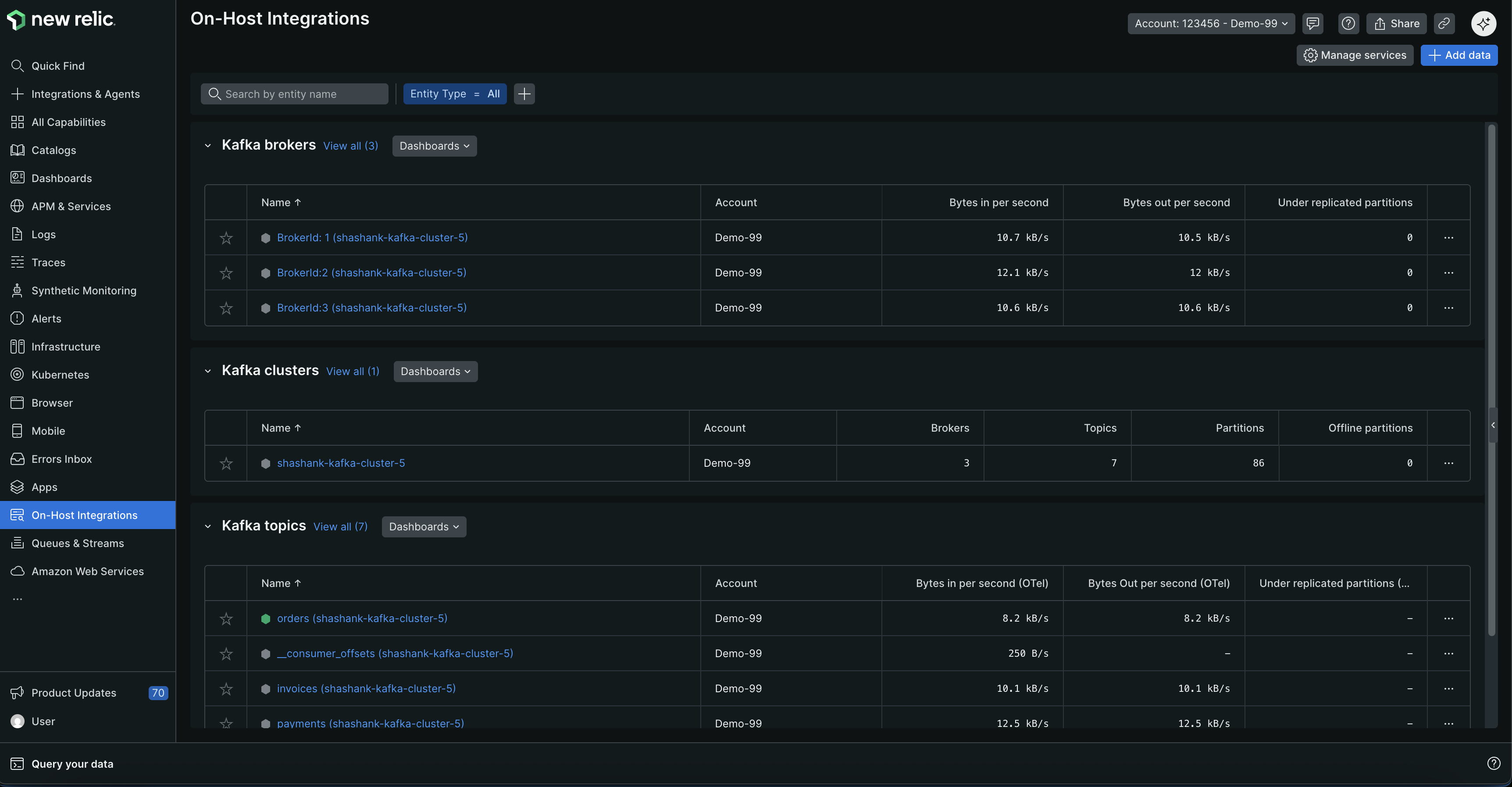 Your Kafka metrics appear in several places across the New Relic platform, each optimized for different use cases: