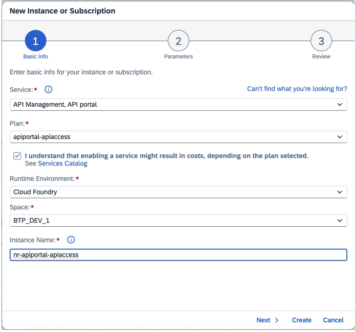 The Create Instance dialog showing Service, Plan, Runtime Environment, Space, and Instance Name fields for SAP Cloud ALM API