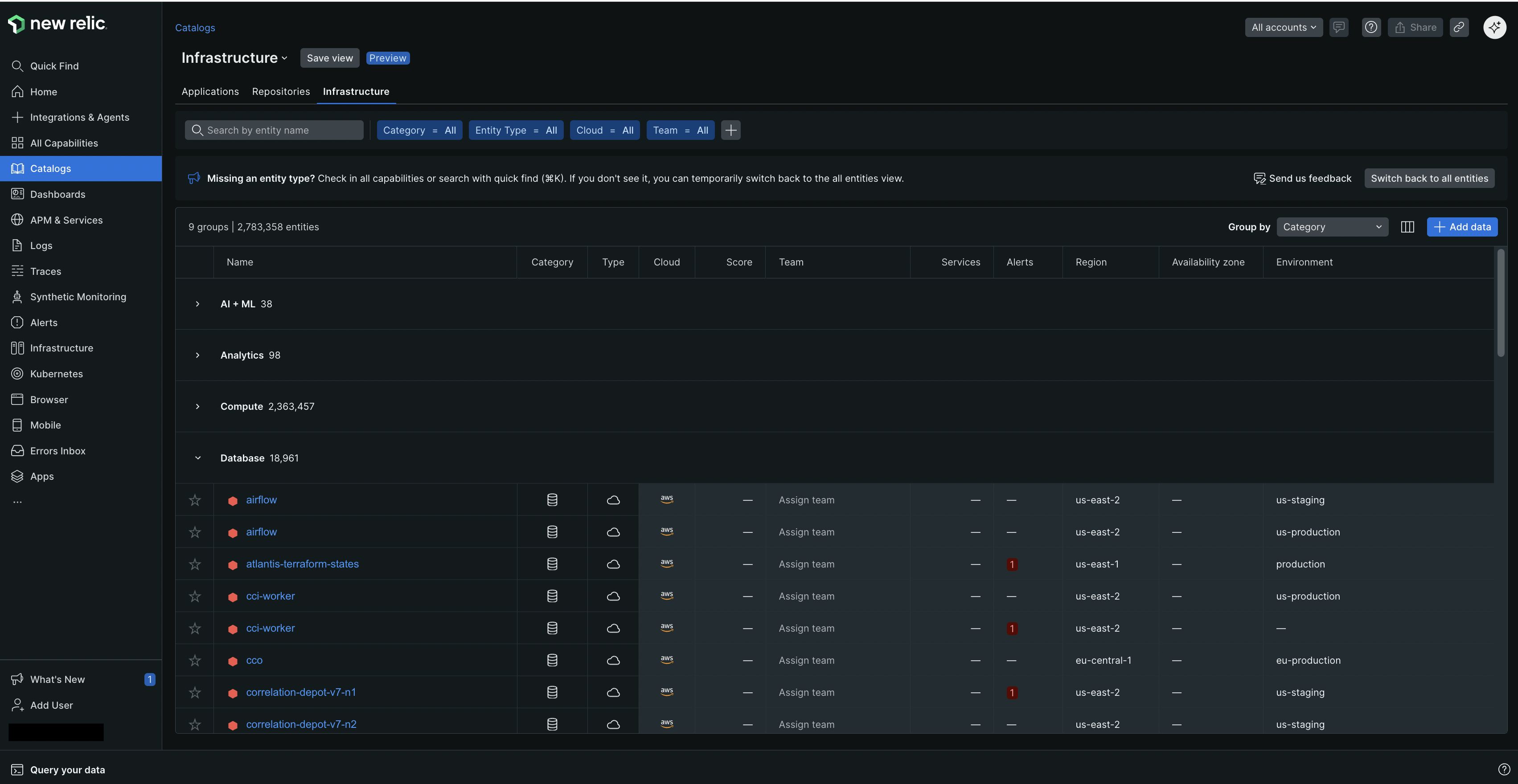 The Infrastructure catalog is available in the New Relic platform, providing a comprehensive view of your infrastructure resources. You can use it to manage your resources, accelerate root cause analysis, and identify observability gaps.